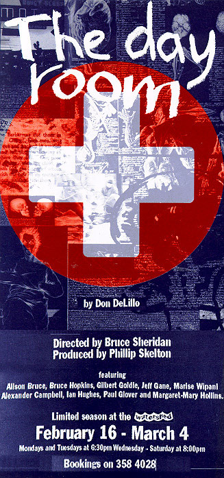 After opening night, I had to get hold a copy of the script for "The Day Room". This was outstanding contemporary theatre done justice by an excellent Auckland crew. Director Bruce Sheridan boasted that every actor he asked had said yes after reading the script, further proof that Auckland had very luckily been thrown a wild ball to play out on its quiet theatrical court.